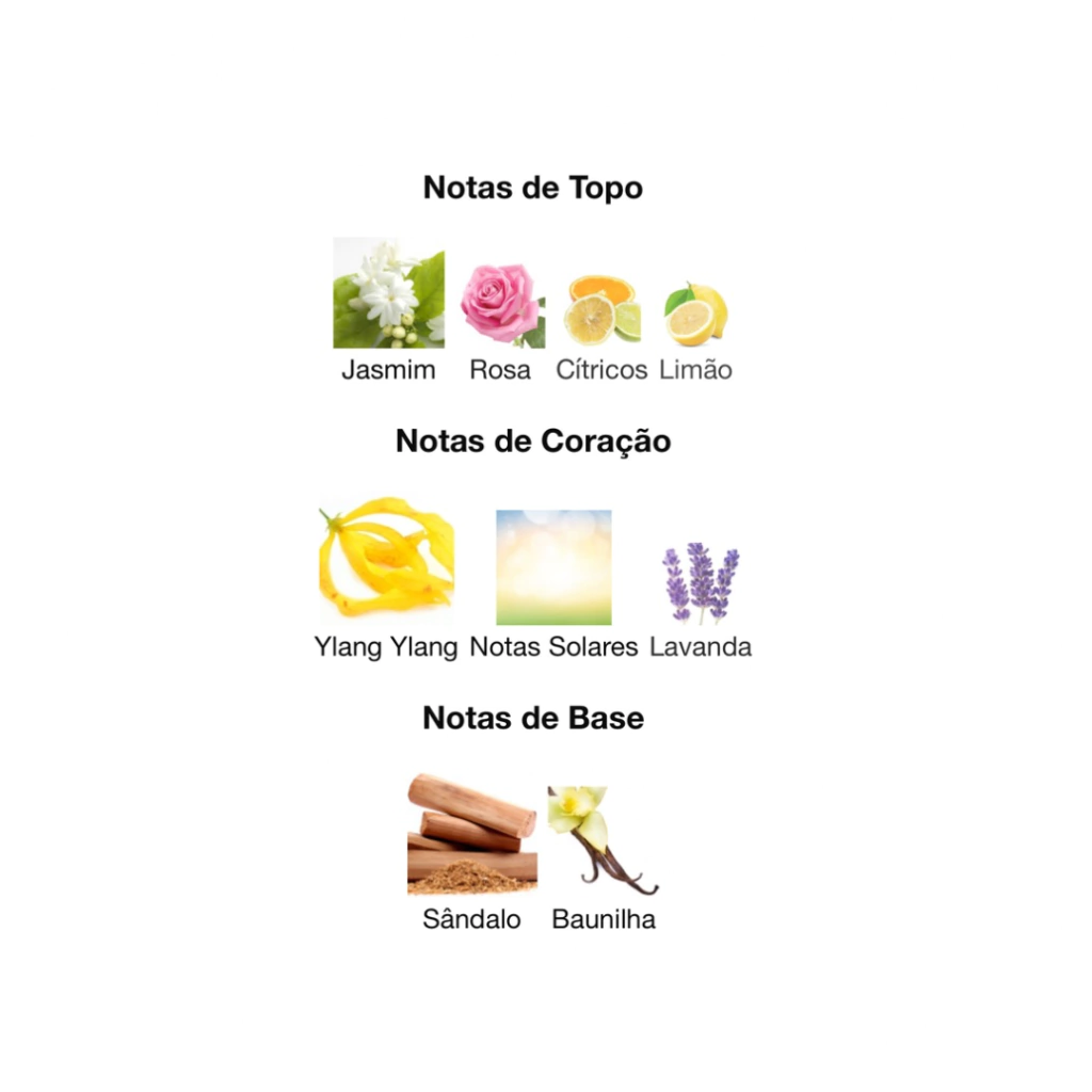 O coração olfativo é construído com um absoluto de Jasmim luminoso e Ylang Ylang solar, proporcionando uma camada de feminilidade delicada e ao mesmo tempo poderosa. O Sândalo confere à composição um toque quente e envolvente, adicionando profundidade e sensualidade ao conjunto.
